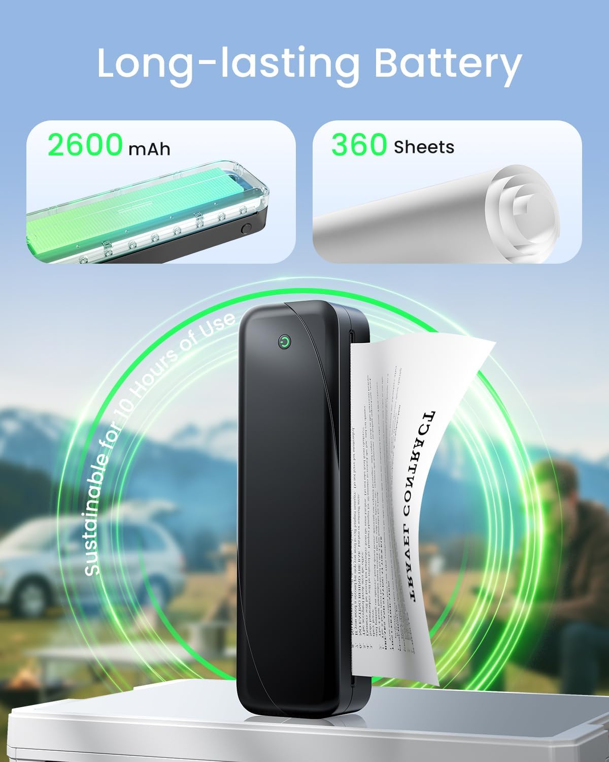 Inkless Printing Technology: Our mobile printer allows you to enjoy the convenience of inkless printing with no need for messy ink cartridges. This inkless printer delivers a sharp 300DPI print quality, powered by a long-lasting 2600mAh battery that enables you to print up to 150 sheets continuously for up to 3 hours using just one roll of thermal paper